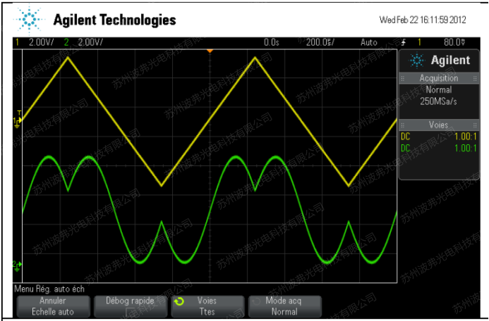 下圖中黃色的曲線是鋸齒波射頻的電信號(10Vpp)作用于電光強度調制器MX-LN-10調制器射頻接口上。綠色曲線是強度調整器輸出的光強,通過測量p相移所需的電壓,VpRF=4.8V@1540nm。使用不同頻率的射頻電信號,我們可以測得對應頻率下的VpRF。但是這種測量方法,并且隨著頻率的升高,所需的高頻設備也會變得非常昂貴。