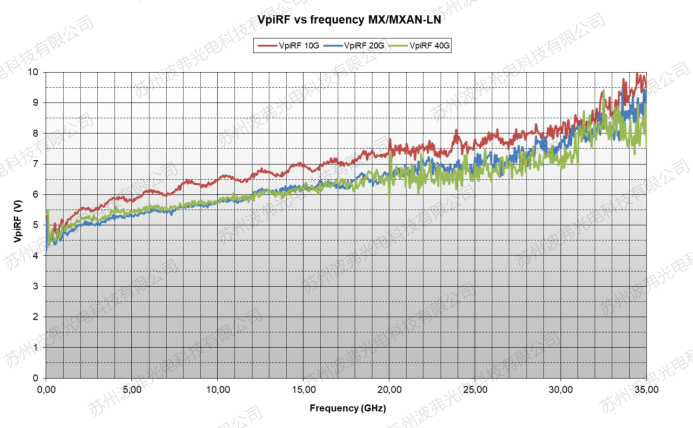 這是因為盡管與材料無關,但是設計和生產方面,任何射頻電子零部件,隨著頻率的升高都會有射頻的衰減,其功率從最高點下降到1/2的位置對應的頻率,我們稱為-3dB帶寬(請參考微信文章“iXblue電光調制器常見參數定義”)。雖然材料本身的參數并不隨頻率升高而變化,但是波導的電極等射頻部分不可避免的存在高頻衰減,因此調制器的射頻半波電壓Vp RF隨著頻率的升高而升高。