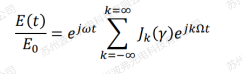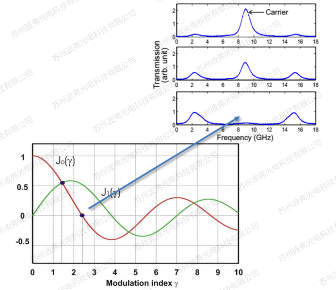 貝塞爾函數模擬計算如下圖所示,當調制深度(modulation index)γ=2.4的時候,載波(紅線)強度為零,調制深度定義為: