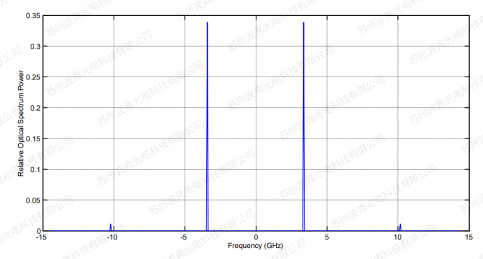 從上圖可以看出,當調制深度為2.4的時候,載波消失,請參考微信文章“電光調制器半波電壓隨頻率的變化”,CS-SSB情況下,下圖為相位調制器輸出光譜的模擬計算結果,載波在”0”所處位置消失,±1階,±2階和±3階邊帶清晰可見,左右對稱分布。