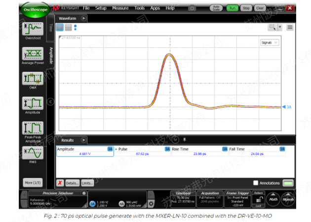 使用AWG,第一調制塊AM1用于產生超短光脈沖。采用iXblueNIR-MX800、MXER1300和MXER高對比度寬帶幅度調制器,分別在850nm、1310nm和1550nm處獲得70ps的超短光脈沖。調制器與驅動器DR-VE-10-MO相結合,DR-VE-10-MO可被設置為方形或高斯脈沖,限幅或線性放大器。采用iXblue偏壓控制器MBC-DG-LAB,在高達數GHz的脈沖重頻下,獲得了較高的脈沖消光比穩定性。