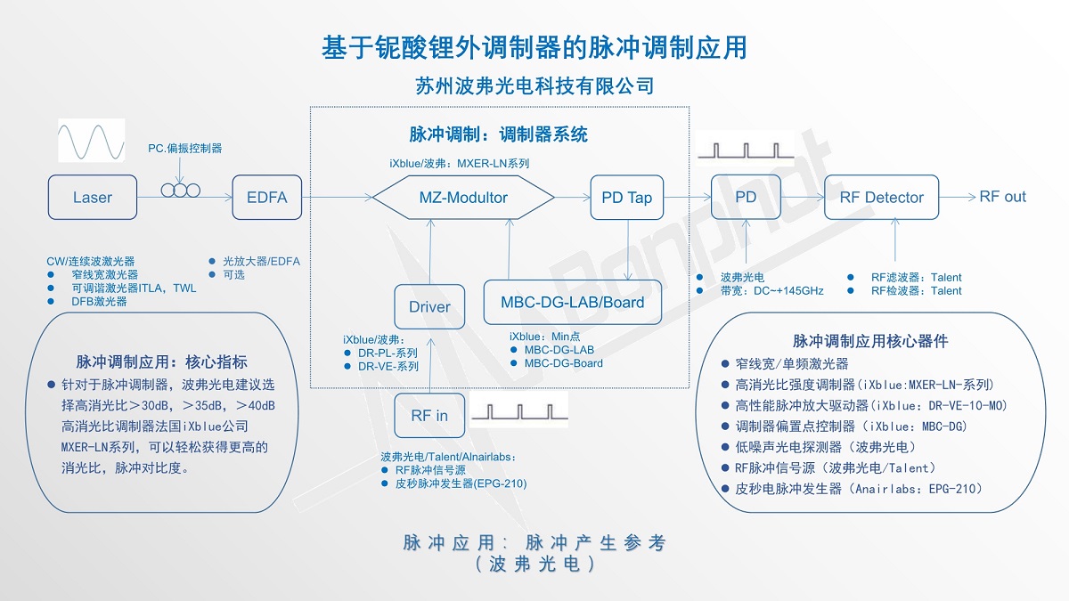 蘇州leyu集團光電科技有限公司提供基于法國iXblue公司鈮酸鋰馬赫增德爾高消光比強度調制器的脈沖調制元件的脈沖調制方案,這些方案包括常用的脈沖產生(脈沖調制)、脈沖整形、脈沖拾取等。基于法國iXblue高消光比強度調制器MXER-LN系列,可以輕松獲得足夠的消光比和脈沖對比度。更多詳細情況請聯系蘇州leyu集團光電科技有限公司相關銷售人員獲取。