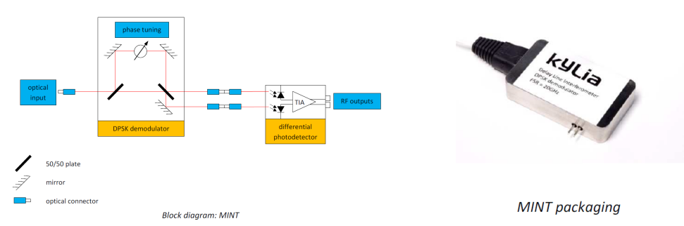 當對傳輸速率的需求高于Gbit/s時,必須開發新的調制和解調技術?;谧杂煽臻g設計和長期的電信技術背景,iXblue能夠為這種復雜的解調提供各種產品。其中一系列產品(iXblue MICS系列,請聯系我們提供更多資料)致力于多路復用和解復用,這意味著能夠在一根獨特的光纖中傳輸許多不同波長的激光(即40路不同波長的激光束在一根典型的電信光纖中傳輸,1528至1560 nm,C波段,)。另一系列產品(iXblue MINT系列,見下圖)使用光的另一個特性進行解調,即電磁波的相位,相位(0或π)的調制比強度的調制更容易、更快。MINT產品使光學DPSK(差分相移鍵控)解調成為可能,它適用于大約10 Gbit/s的更高傳輸速率。i
