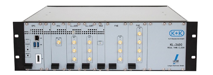 K+K KL-3400實時時鐘的硬件由幾個板組成,每個板都有一個前面板。可選的附加信號發生器(如5MHz或100MHz)、分配放大器等完成了畫面。