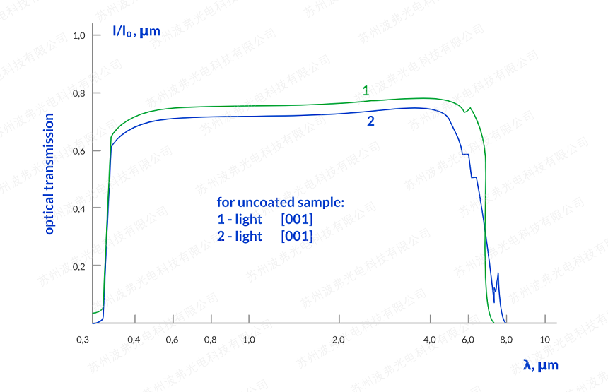 標(biāo)準(zhǔn)TeO2材料在0.450-5 mkm范圍內(nèi)更好;標(biāo)準(zhǔn)TeO2晶體在特殊技術(shù)下生長(zhǎng),最大透射率在0.350 - 0.450 mkm范圍內(nèi),適用于對(duì)澄清效應(yīng)敏感的應(yīng)用;在特殊技術(shù)下生長(zhǎng)的標(biāo)準(zhǔn)TeO2晶體最大限度地減少了2.7 - 3.2 mkm范圍內(nèi)的-OH基團(tuán),以滿足應(yīng)用所需的平面?zhèn)鬏敺秶?