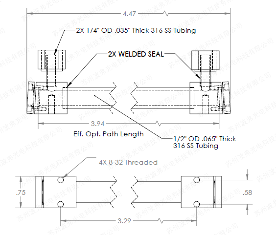 標準光路(相互作用)長度為 10 厘米,但可根據要求提供定制光路長度。 流通池的通光孔徑為 0.375 英寸或 9.5 毫米。