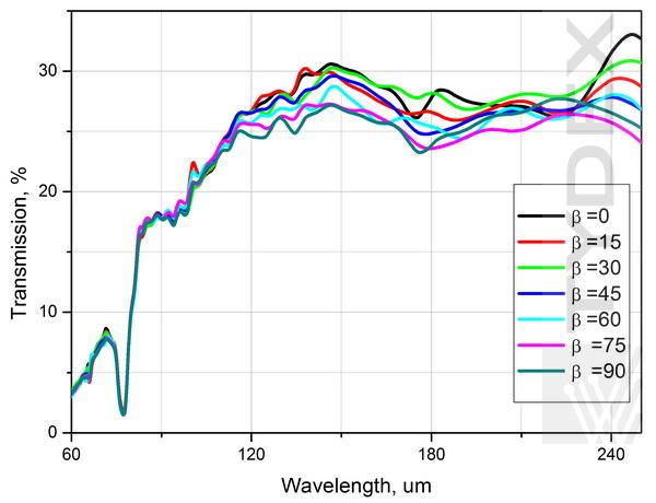 APC L/4@60-300um和AWP L/4@60-95um已使用圖1所示的方案進行了測試。考慮到θ (λ)依賴性(請分別參見圖3a和3b),APC和AWP相對于偏振器軸定位。使用FTIR光譜儀Bruker Vertex 70測量了分析儀不同位置的APC透射光譜(請參見圖4)。