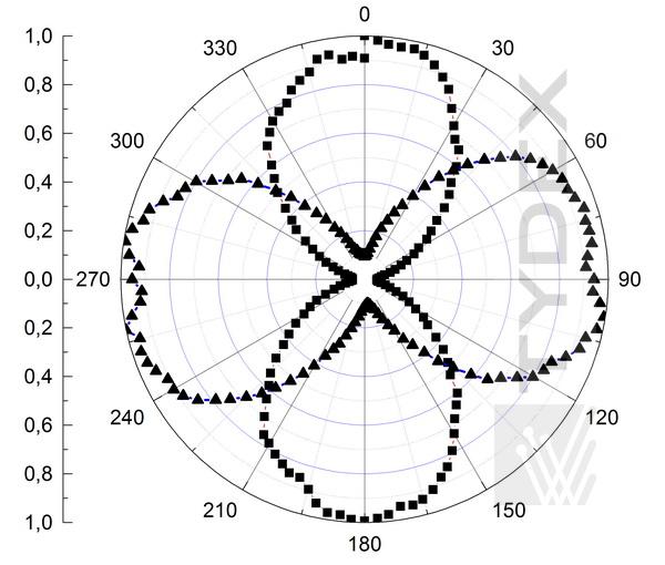 圖6. b)在圓偏振輻射通過AWPL/4@60-95um的情況下,激光輻射強度與分析儀旋轉角度的關系