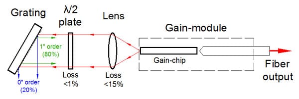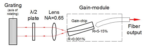 該設(shè)備包括帶有彎曲條紋的“C型”增益芯片。條紋傾斜的刻面專為外部反饋而設(shè)計,并具有深層 AR 涂層,從而使芯片波導(dǎo)的背反射極低。它確保了自激的阻斷,并消除了在外腔系統(tǒng)中操作時與復(fù)合腔相關(guān)的問題。這導(dǎo)致在整個調(diào)諧范圍內(nèi)具有高邊模抑制比 (SMSR) 的非常精細(xì)的譜線。具有垂直條紋的刻面具有適當(dāng)?shù)姆瓷渎剩ㄍǔT?5-15% 的范圍內(nèi)),以同時提供寬波長調(diào)諧和高輸出功率。標(biāo)準(zhǔn)器件中這一方面的反射針對在外腔設(shè)置中的操作進(jìn)行了優(yōu)化,該設(shè)置為芯片提供了有效的反饋(約 50%)(如圖所示)。對于反饋較低的方案,我們建議使用在刻面上具有不同涂層的定制設(shè)備,以提供優(yōu)化的反射。
