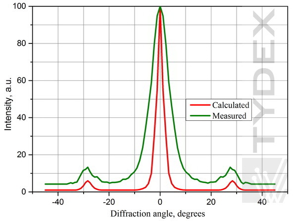為了驗證操作并比較計算參數和實際參數,在具有不同太赫茲輻射源的各種光學布置中測量了光柵的特性。使用了兩個來源。第一個是 FIR 激光器,一種由可調諧 CO2 激光器(彼得大帝圣彼得堡理工大學)光學泵浦的亞毫米甲醇蒸汽激光器。第二個是 FEL,一種自由電子激光器(西伯利亞同步加速器和太赫茲輻射中心,Budker 核物理研究所,RAS)。圖 3 和圖 4 描繪了當 FIR 激光用作輻射源時,間距 d=250 μm 的 TPX 和 ZEONEX 光柵的單色波強度 (λ=118 μm) 與衍射角的關系。圖 5 和 6 給出了由 FEL 照射的相同光柵的單色波強度 (λ=141 μm) 與衍射角的關系。在第二種情況下,會聚透鏡放置在光柵和輻射傳感器之間。這些圖的比較表明,在第一種情況下,零階最大值和一階最大值比透鏡排列更寬。這是由于會聚透鏡聚焦平行光束。用戶在根據自己的意圖設計實驗時必須考慮到這一點。當光柵用于研究輻射源的特性(功率、光束形狀、能量分布等)時,透鏡是多余的。但是當需要解析譜線時,鏡頭就變得很有必要了。