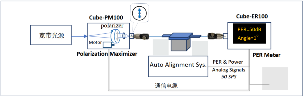 在測(cè)量保偏器件的偏振消光比(PER)時(shí) ,較低的光源線偏振度 ,以及線偏振光與保偏光纖光軸之間的對(duì)軸角度偏差是PER測(cè)量誤差的主要來源。為了最大限度的消除這兩種測(cè)量誤差源, 本公司自豪地推出了業(yè)界首個(gè)自動(dòng)化偏振消光比測(cè)量系統(tǒng)。