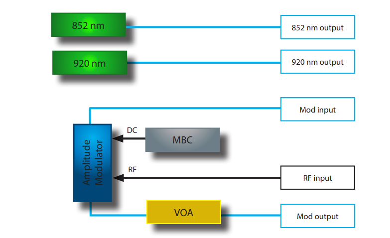 ? 內(nèi)嵌兩個激光源,一個852 nm和920 nm低RIN DBR激光器。為了便于使用,省略了一根外部接插線,將激光輸出連接到調(diào)制器輸入光端口。波長和功率可通過前面板控制或ModBox軟件接口進(jìn)行調(diào)整。