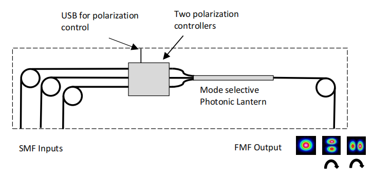 模式多路復用器和多路分解器由兩個光子燈籠組成,一個用于多路復用,另一個用于在一個(多路復用器)上進行偏振控制的多路分解。