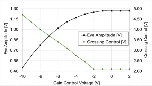 圖13至圖18中的數(shù)據(jù)是使用MICRAM DAC4信號源和帶有50GHz(SE-50)遠程采樣模塊的LeCroy SDA 100G采樣示波器獲得的。所有測量均在270mV輸入眼振幅和51%輸入眼交叉點進行。增益控制和交叉控制功能取決于輸入幅度。交互調(diào)整兩個控件以控制輸出振幅,同時保持50%的交叉點,如圖15至圖18所示。
